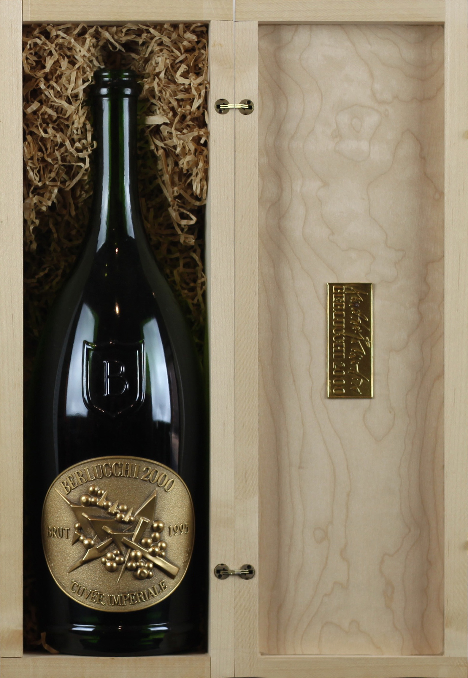 Arnaldo Pomodoro ( Morciano di Romagna 1926) Berlucchi 2000 Dim. 38x12 Bottiglia di vetro con applicata opera in bronzo di Arnaldo Pomodoro. Cofanetto in legno con etichetta in bronzo firmato Arnaldo Pomodoro di dim. 44x14x15 Firmato al fronte e sul cofanetto