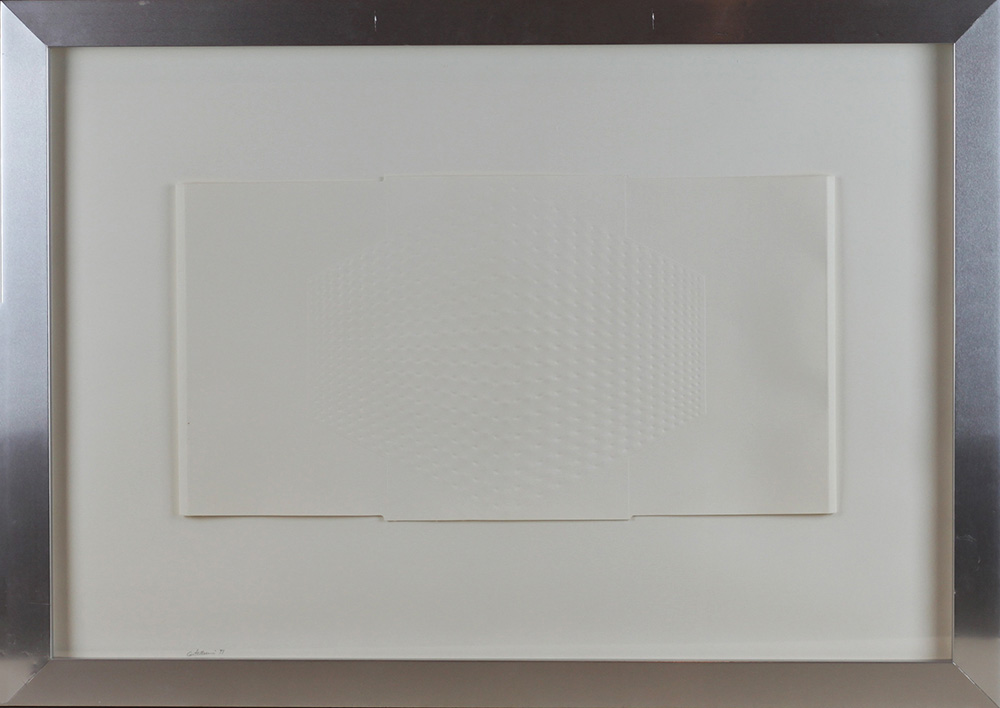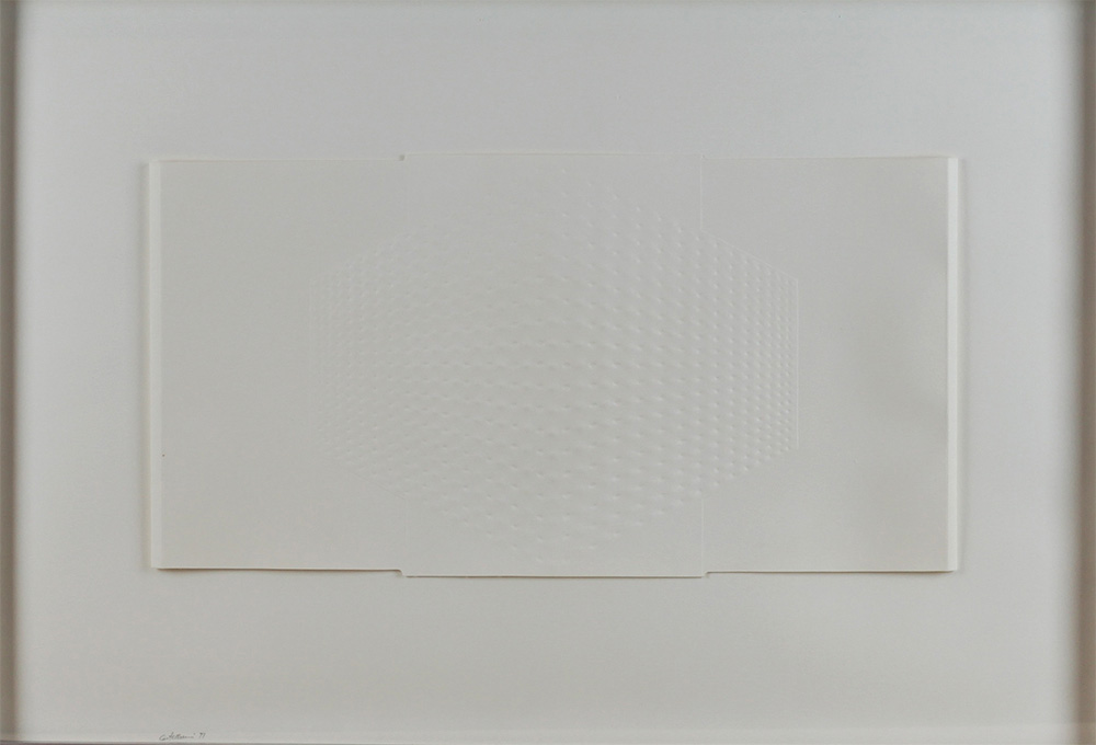 Enrico Castellani ( Castelmassa 1930 - Celleno 2017) Superficie bianca 1971 Dim. 53x74 Rilievo su carta Cartoncino schedario Milani, Fabbriano, stampatore Renato Volpini Milano. Mail di conferma da parte dell'archivio Castellani circa la tiratura e la presenza delle 5 copie non numerate. Pubblicazioni : “Enrico Castellani. Opera Grafica 1960 – 1995”. Ed. Corraini, Mantova, 1996. Tiratura 150 esemplari in cifre arabe da 1/150 a 150/150 + 5 copie firmate e datate, non numerate. Provenienza collezione privata Firmato e datato in basso a sx