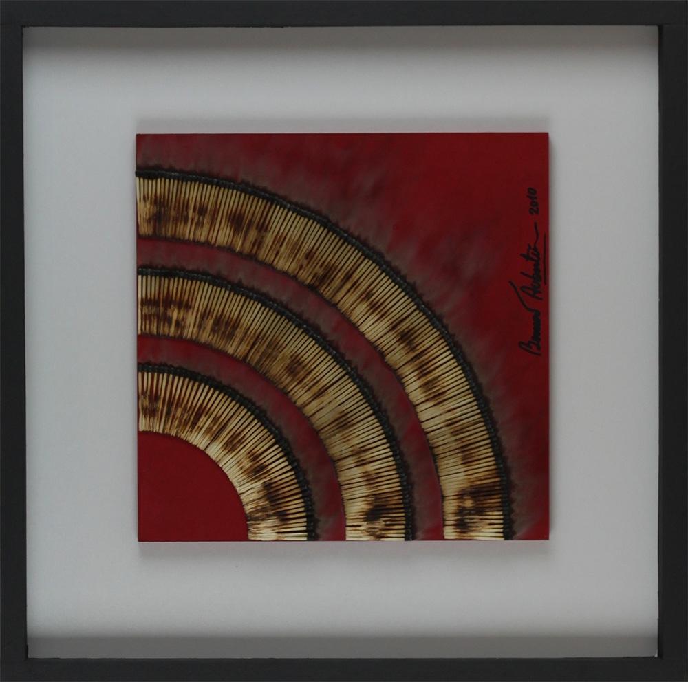 Bernard Aubertin ( Fontenay-aux-Roses 1934 – Reutlingen 2015) Dessin de feu sur table rouge 2010 Dim.30x30 Tecnica mista su tavola Certificato di autenticità firmato Bernard Aubertin Firmato e datato di lato a dx