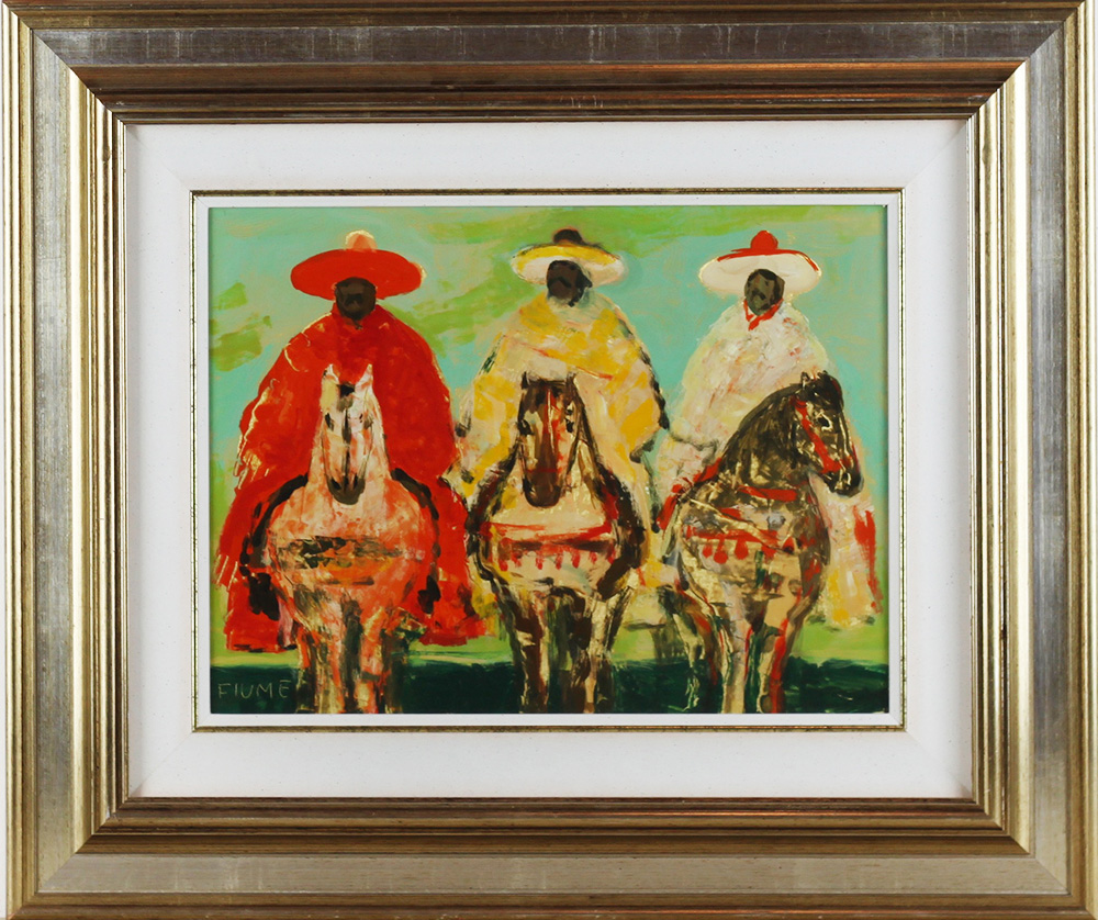 Salvatore Fiume ( Comiso 1915 – Milano 1997) I tre messicani Dim.27x36 Olio su tavola Autentica su foto del figlio dell'artista in data 12/01/2004 Firmato in basso a sx