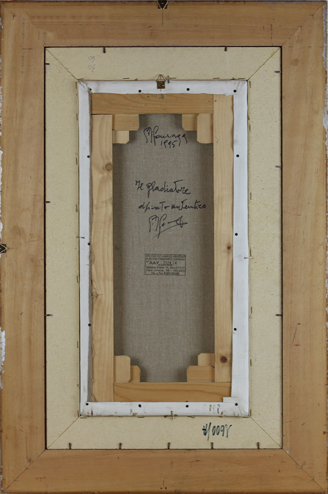 Giovan Francesco Gonzaga ( Milano 1921 – Milano 2007) Il gladiatore 1995 Dim.60x30 Olio su tela Opera archiviata al numero AAV35N24 dell'archivio generale del maestro Giovan Francesco Gonzaga Al verso firma, data, titolo e timbro dell'archivio Firmato e datato in basso a dx