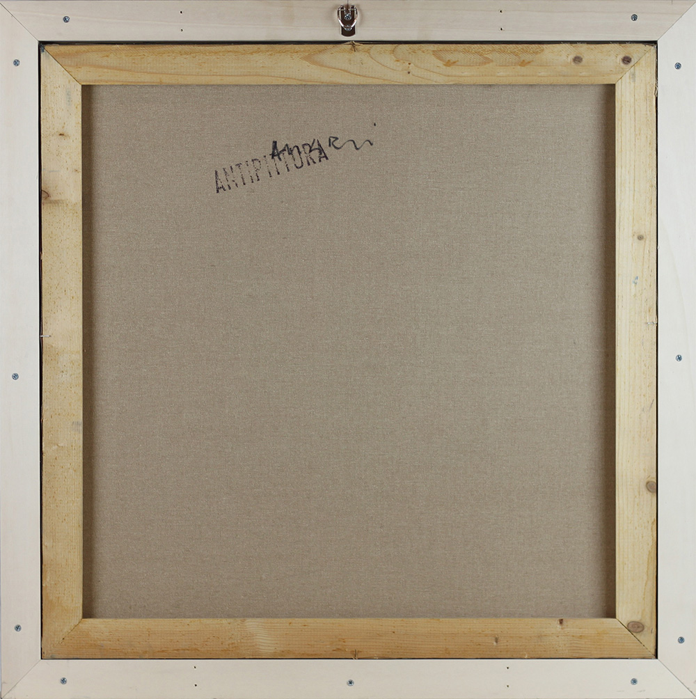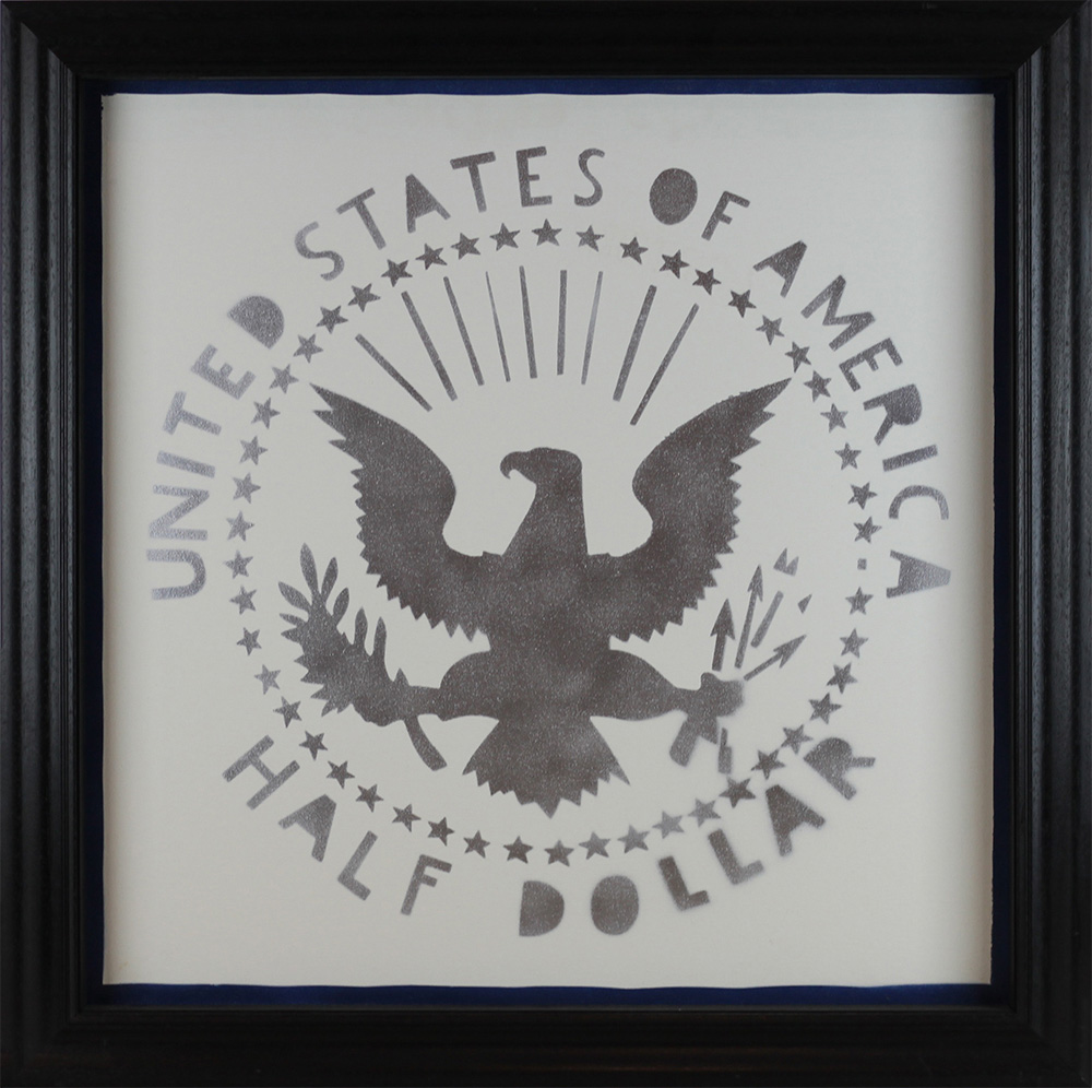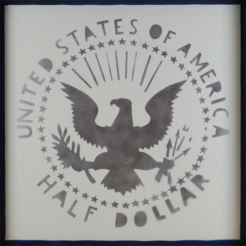 Franco Angeli ( Roma 1935 – Roma 1988) Half Dollar Anni 80 Dim.70x70 Tecnica (antipittura) pittura spray/toile Autentica su fotocopia di Soligo con spiegazione della tecnica “ANTIPITTURA” Firmato al verso