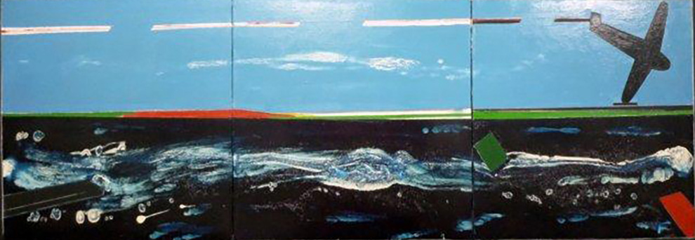 Franco Angeli ( Roma 1935 – Roma 1988) Progetto per grande paesaggio di mt. 8 x 2,5 1986 Dim.50x150 Smalto su tre tele L'opera verrà consegnata dopo l'archiviazione Provenienza Galleria L'Indiano Firenze Al verso data, firma e titolo