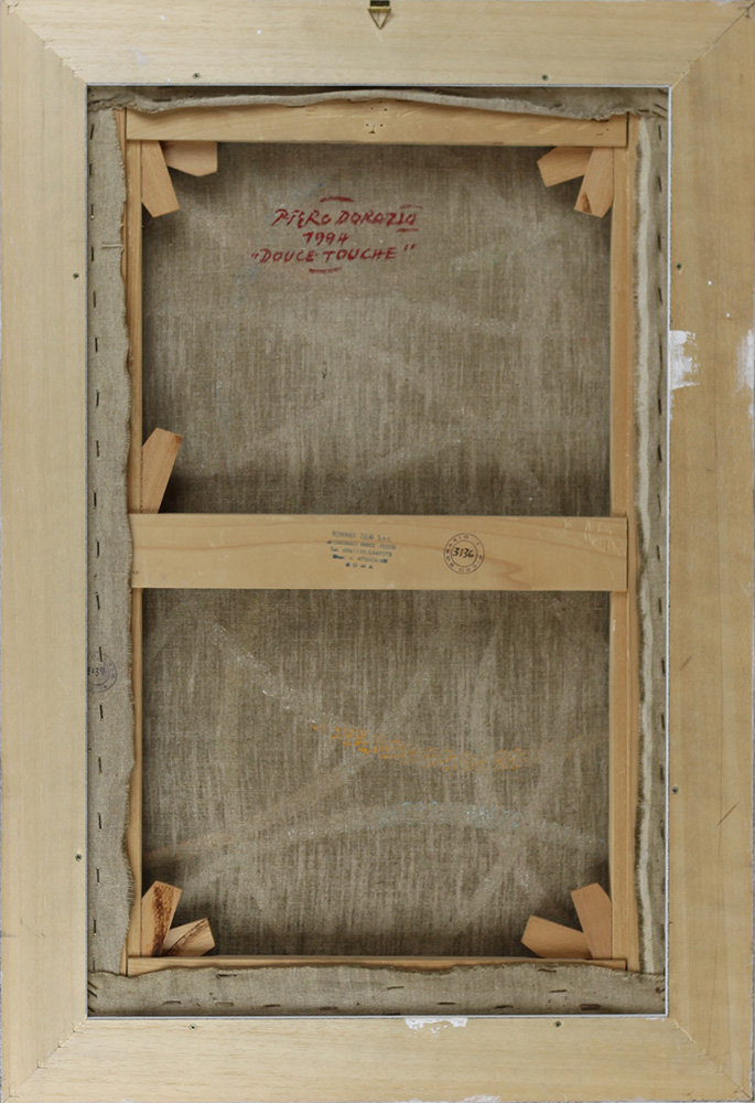 Piero Dorazio ( Roma 1927 – Perugia 2015) Douce touche 1994 Dim.70x45 Olio su tela Lettera di Piero Dorazio alla Signora Ismene Chigi dove dichiara che il dipinto che ha acquistato è autentico e le spiega che reca i numeri di catalogo 3136 e 3137 impressi al verso assieme alla sua firma Al verso firma, data, titolo e numeri di catalogo