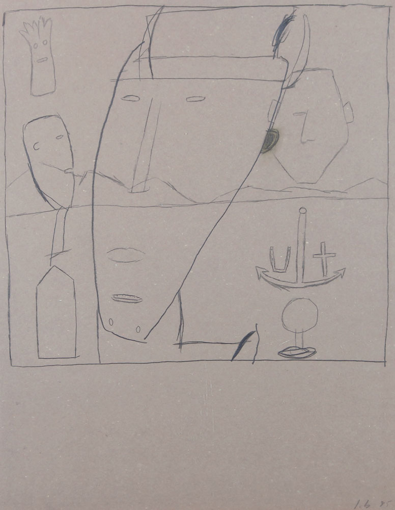 JAMES BROWN Los Angeles 1951  Self portrait, 1985 matite su carta beige a mano cm. 60x45, sigla dell'artista e anno in basso a destra, etichette della Galerie Lelong (Paris) e della Link The Contemporary Art Company al retro, dichiarazione d'autenticità dell'artista su foto, pubblicato sul catalogo della mostra "Anima o corpo?" a cura di Roberta Ridolfi, tenutasi presso il Centro per l'Arte Contemporanea Il Conventino, ex Convento dei Servi di Maria (Monteciccardo-PU), 2004, pagina 20.