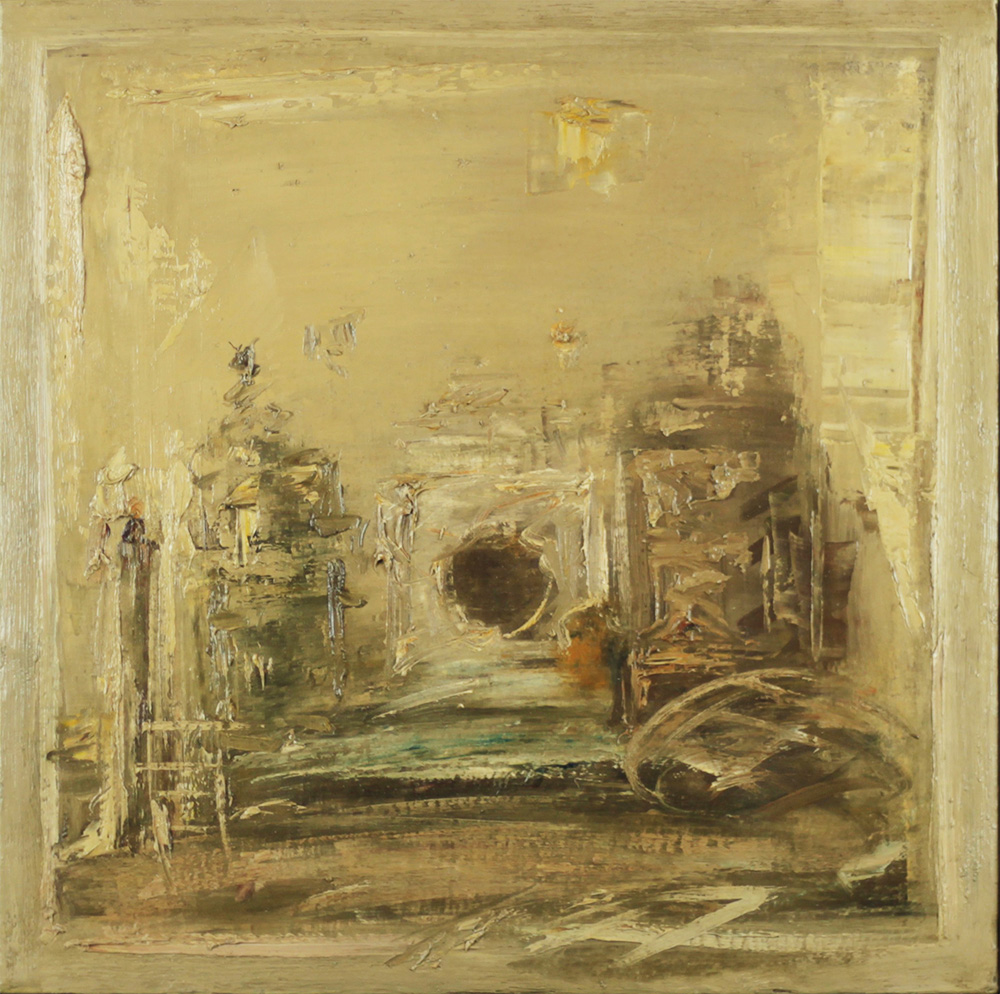 Giancarlo Ossola ( Milano 1935 – Milano 2015) Oggetti 1979 Dim.55x55 Olio su tela Autentica su foto dell'artista in data 16/04/1994 Al verso altra composizione con titolo “Città Minacciata” 1978 Al verso titolo, data, misure e firma