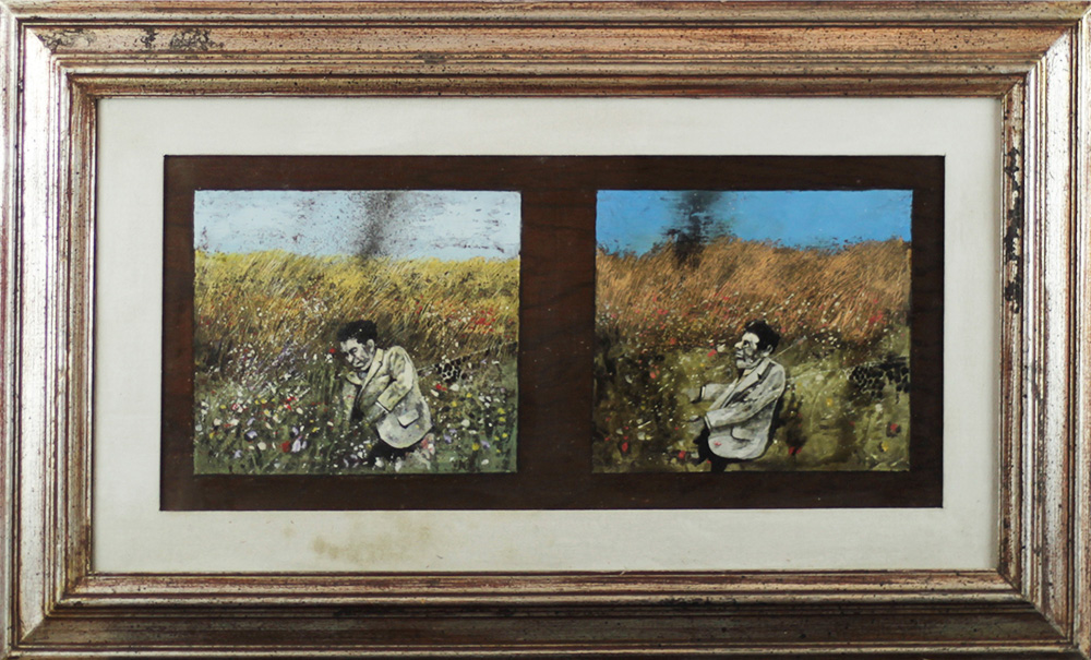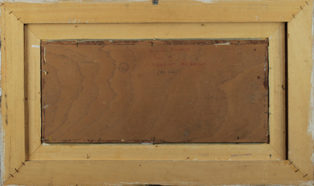 Giuseppe Banchieri ( Milano 1927 – Ronchi di Massa Carrara 1994) Figura nel paesaggio 1978 Dim.26x58 Olio su tavola Autentica su foto dell'artista Al verso firma, data e titolo