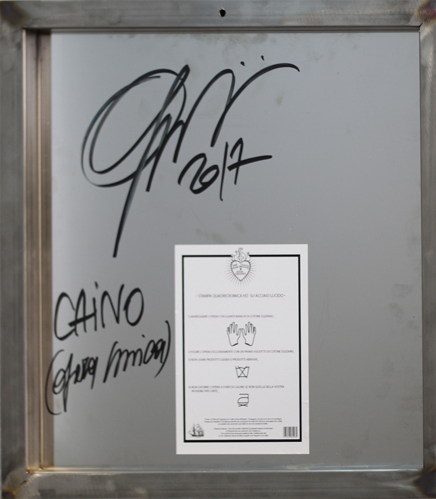Pep Marchegiani ( Pescara 1971) Caino 2017 Dim.50x50x2,1 Stampa quadricromica su acciaio supermirror con cofanetto in compensato Certificato di autenticità Al verso adesivo istruzioni, firma, titolo, data e la dicitura opera unica