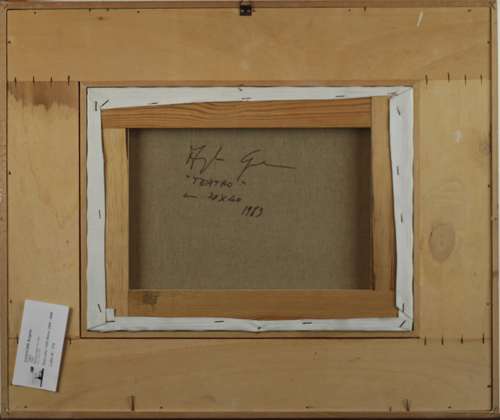 Angelo Cagnone ( Carcare 1941) Teatro 1983 Dim.30x40 Olio su tela Autentica su foto dell'artista in data 29/05/1988 Al verso firma, titolo, dimensioni e data