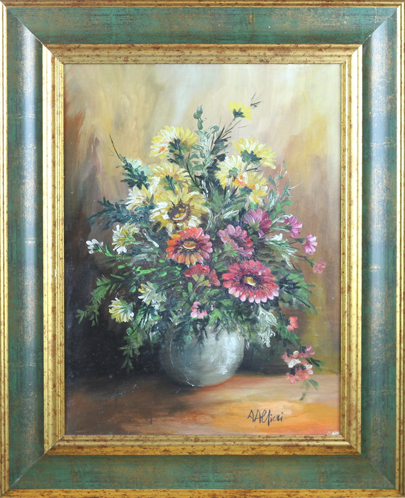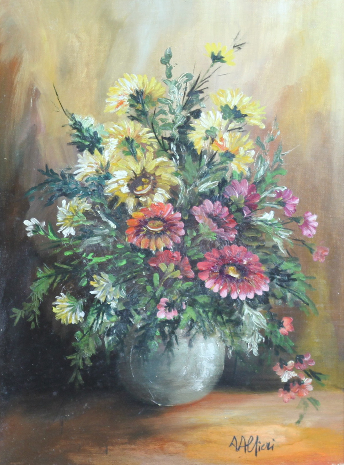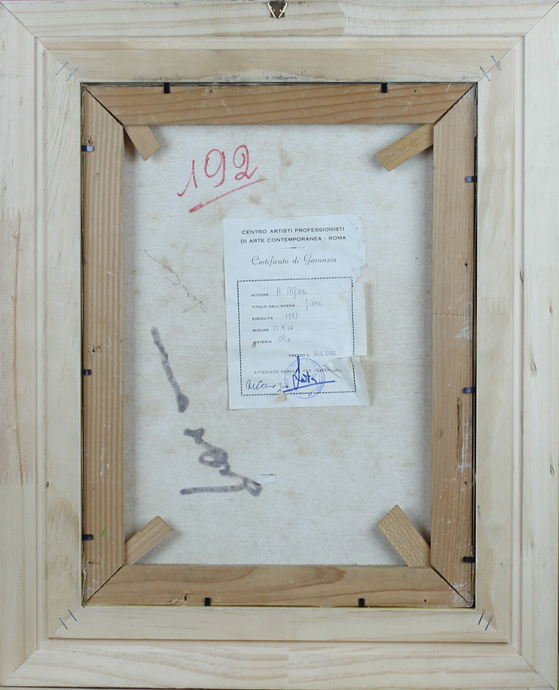 A. Alfieri Fiori 1973 Dim.40x30 Olio su tela Al verso certificato di garanzia Centro Artisti Professionisti di Arte Contemporanea Roma Firmato al verso Firmato in basso a dx