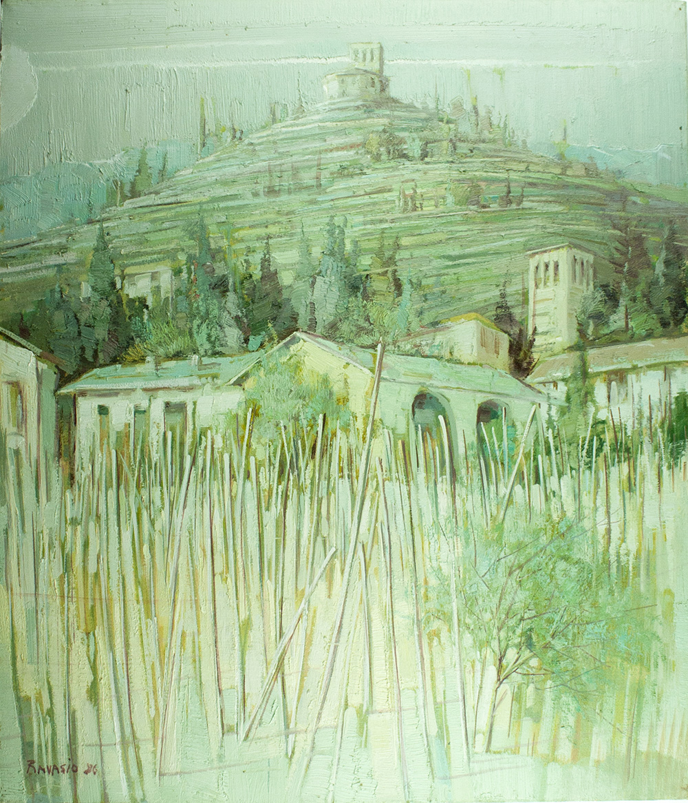 CESARE RAVASIO " Sotto il monte " anno 1986 olio su tela cm 70X60 firmato e datato in basso a sx; firmato, datato e titolato al retro