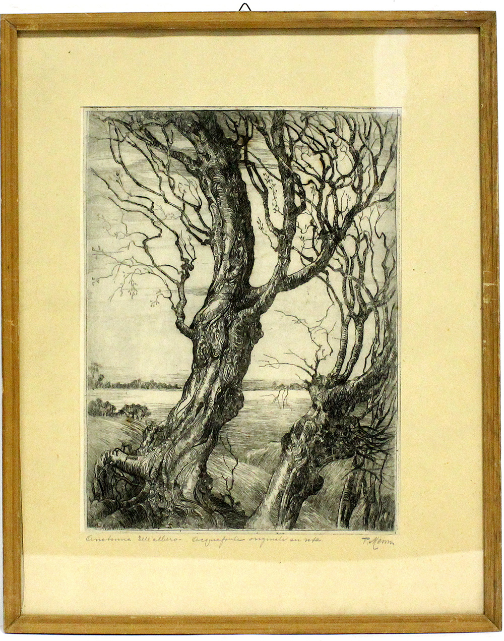 Firma indecifrata "Anatomia dell'albero" acquaforte su seta (cm 29x21 circa) firmato e titolato in basso a lapis, in cornice (lievi difetti)