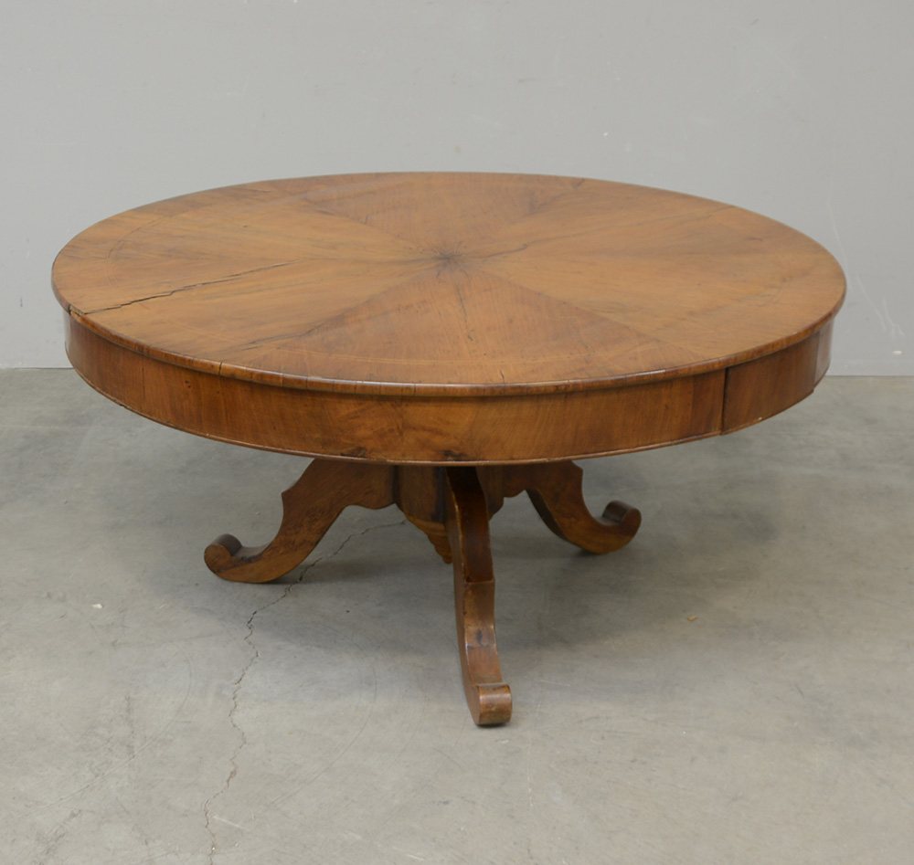Tavolo da salotto di forma tonda lastronata in noce con piano filettato in legno chiaro, gamba a colonna tornita terminante a tre piedi sagomate (d. cm 112 h. cm 53) (difetti)