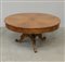 Tavolo da salotto di forma tonda lastronata in noce con piano filettato in...