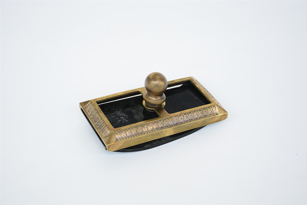 Supporto a mezza luna per carta assorbente in metallo, decorato a palmette (difetti).
