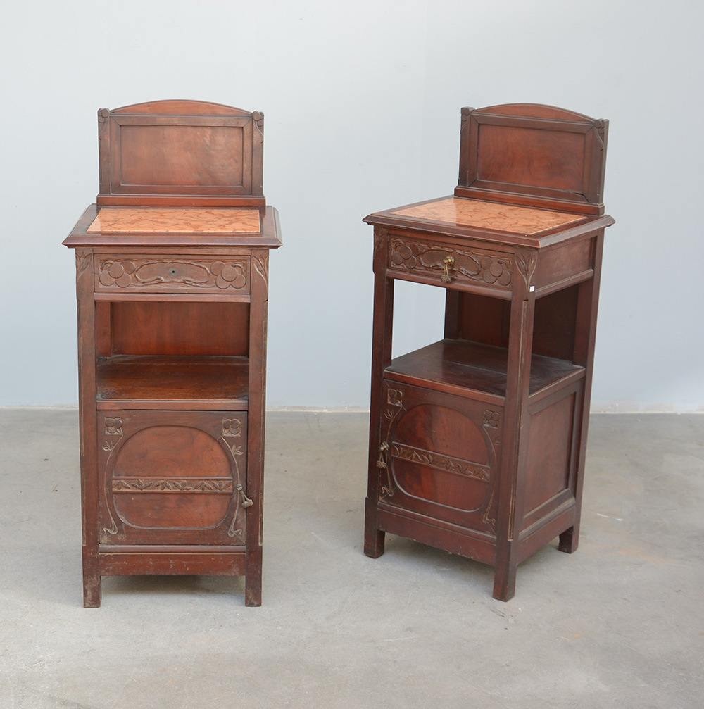 Coppia di comodini liberty in legno con intagli a foglie e fiori stilizzati, piano in marmo rosso e piano a giorno fra il cassetto e lo sportello, e piccola alzatina (cm 43x105x38) (difetti)