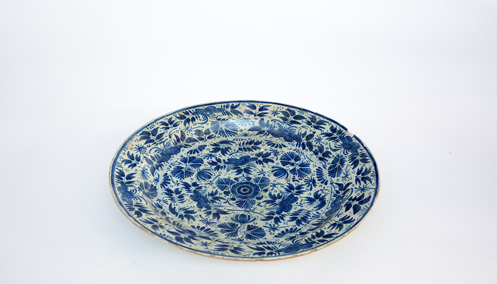 Piatto decorato in monocromia turchina con fiori in blu (d. cm 34,5)(difetti e restauri)