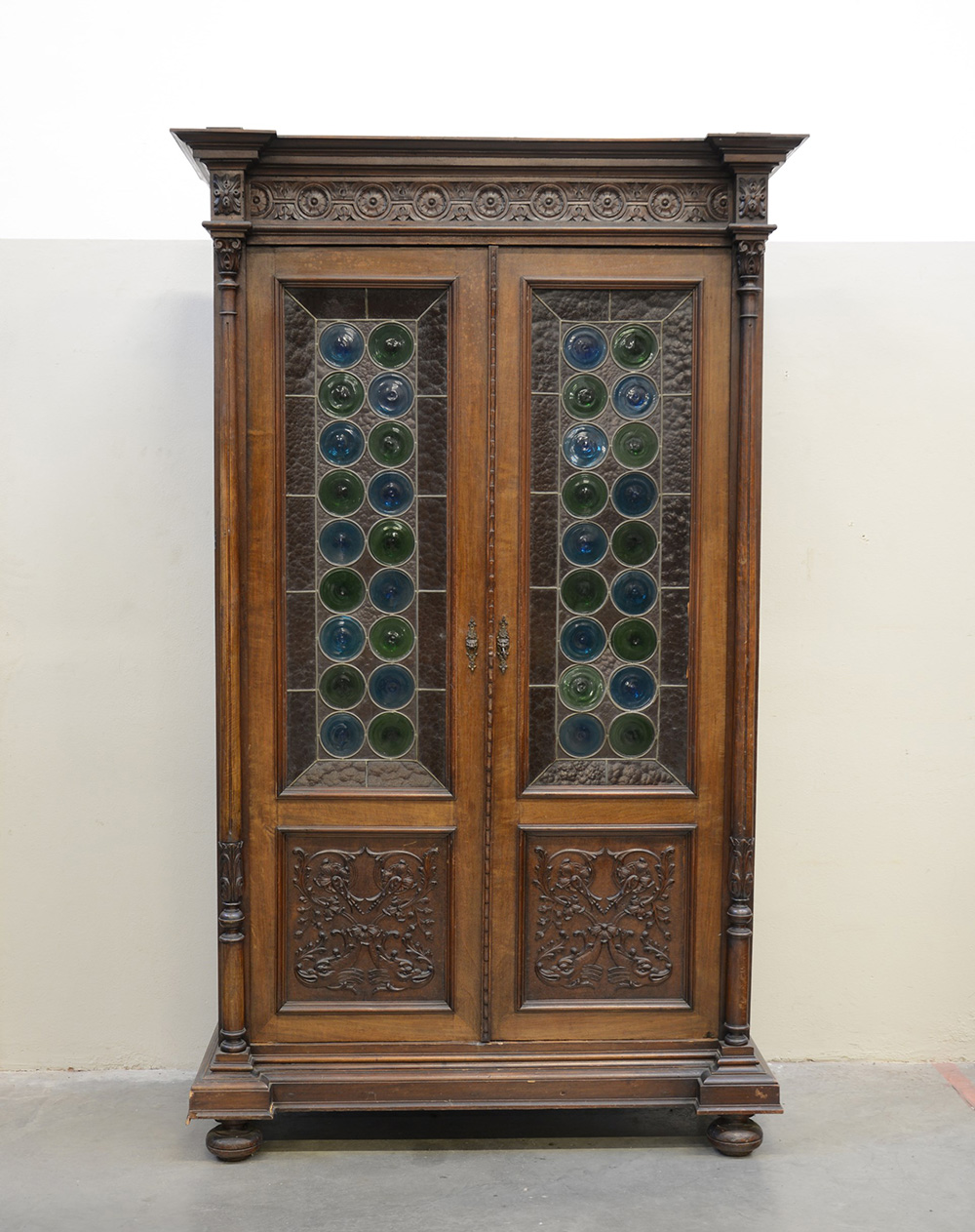 Armadio a due battenti con parte inferiore decorata a motivi floreali intagliati e parte superiore a mosaico di vetri colorati legati a piombo; montanti laterali a colonna tornita e piedi a cipolla; inizio secolo XX (126x215x56) (difetti e mancanze)