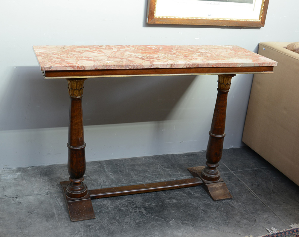 Consolle in noce di forma rettangolare con montanti a colonna tornita con capitelli dorati. Piano in marmo. Sec. XIX (cm 120x82x40) (difetti)