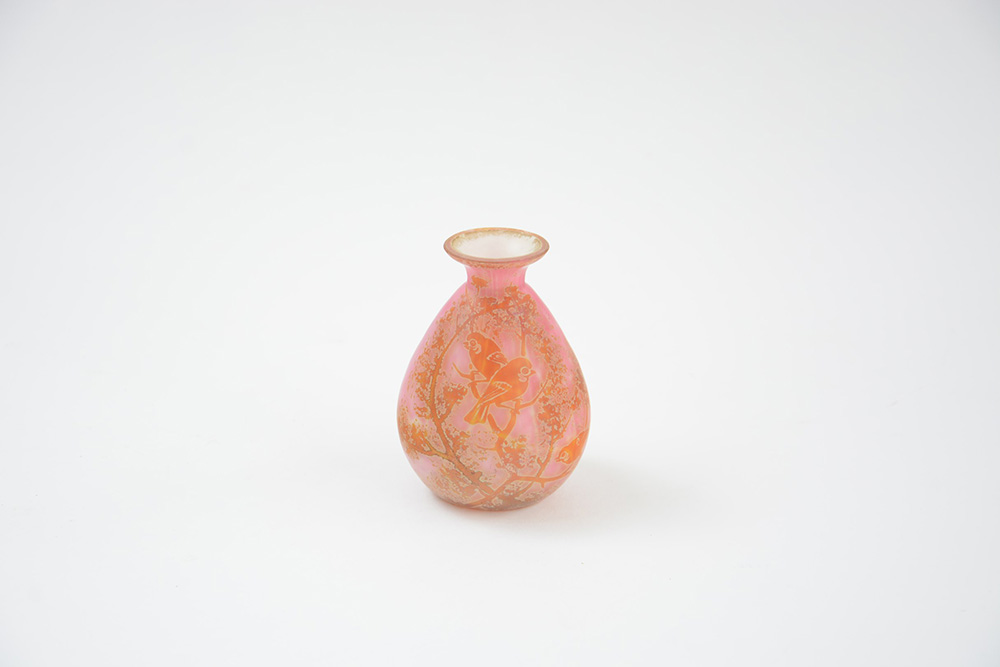 Piccolo vaso in vetro rosa incamiciato, decorato con uccelli su rami (h cm 11)