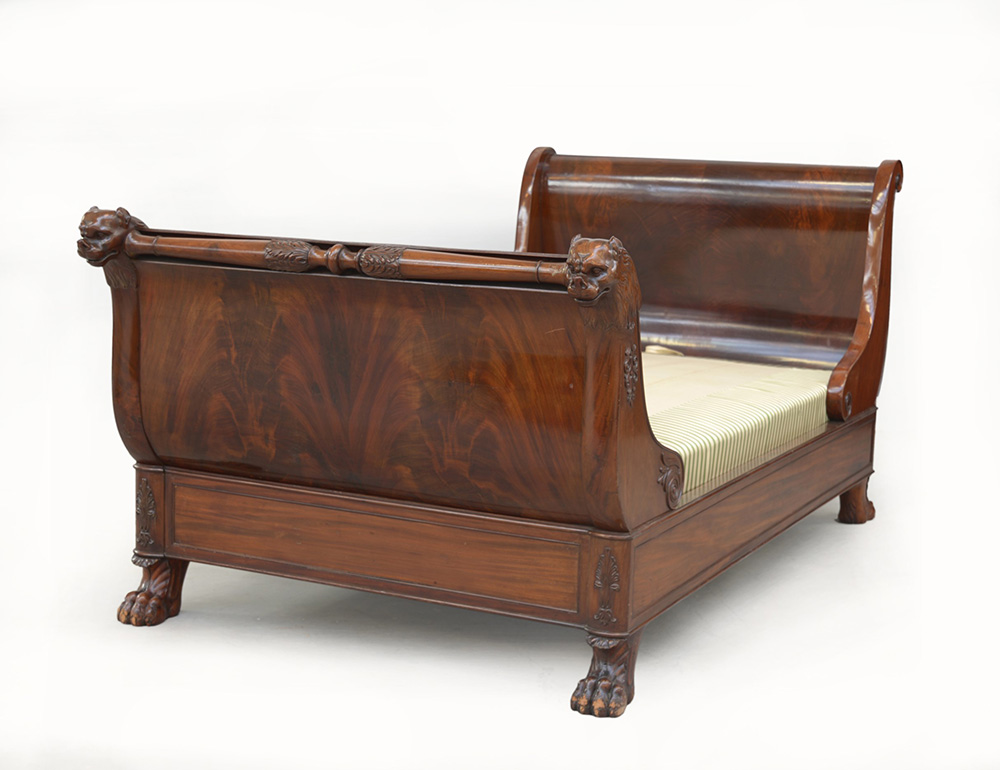 Letto a barca in mogano e piuma di mogano a una piazza e mezza con piedi ferini e teste di animale scolpite, completo di cassone (cm 130x116x240) (lievi difetti)