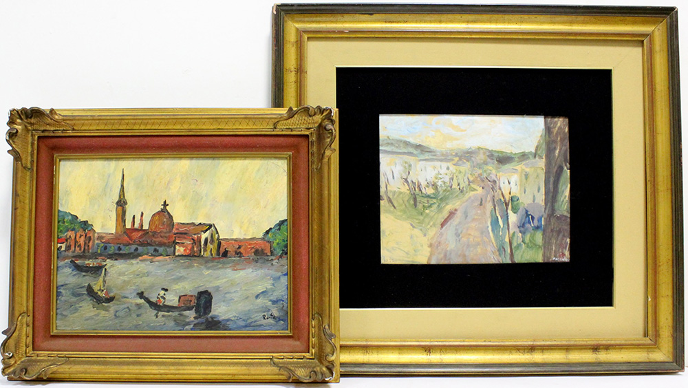 Lotto di due dipinti ad olio e tempera raffiguranti paesaggi, firmati Rota e Passani, misure differenti, in cornici (difetti)