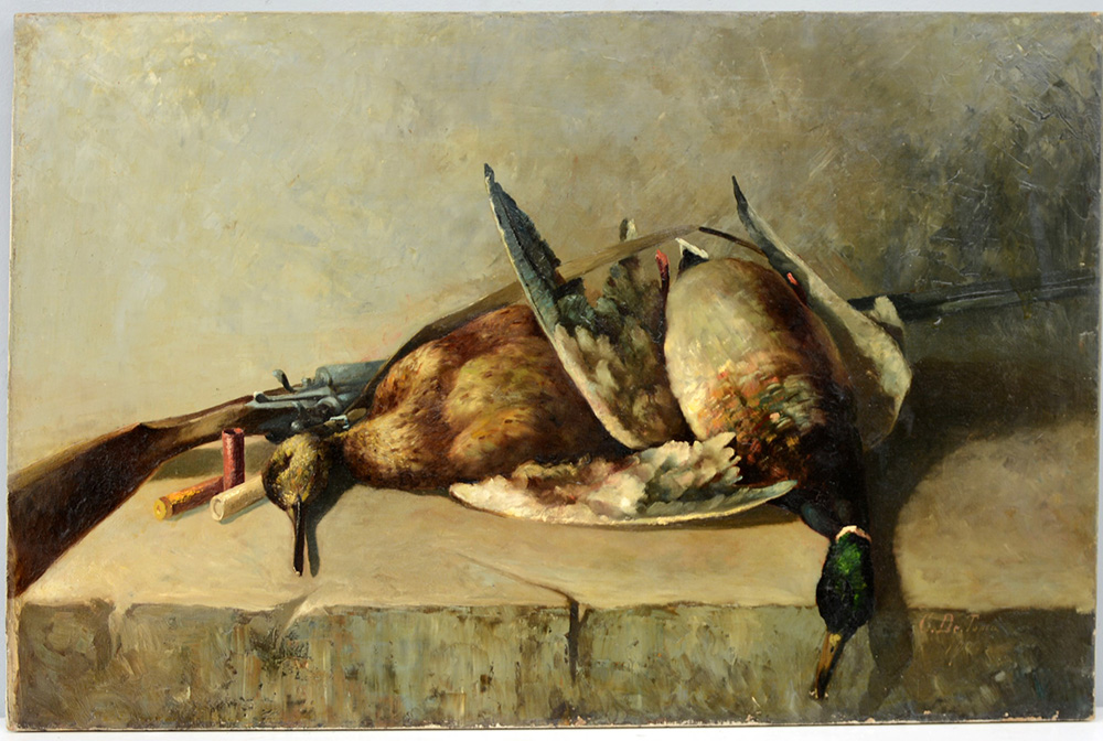 "Cacciagione" olio su tela (cm 57x90) Firmato e datato in basso a destra