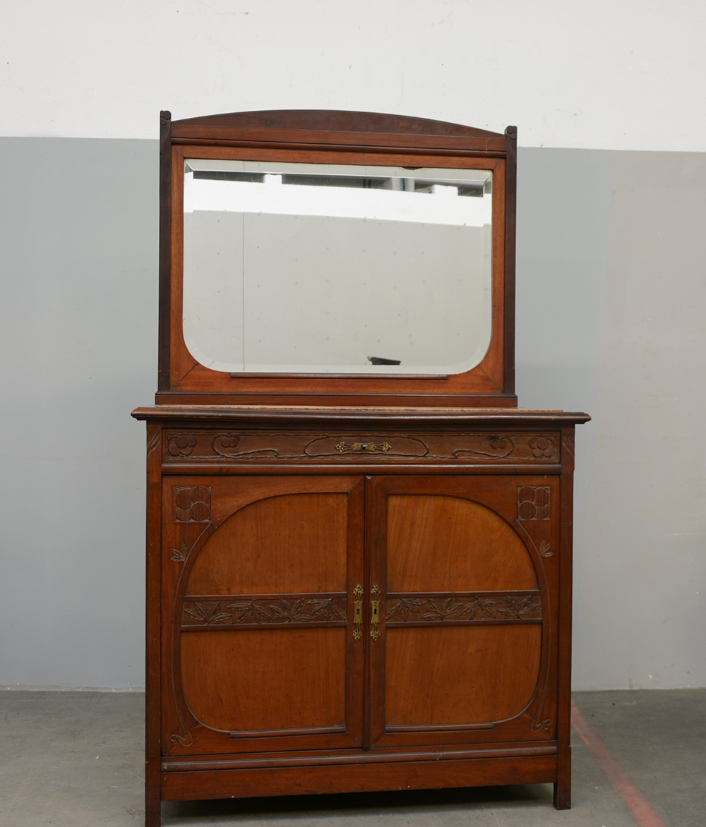 Commode liberty ad un cassetto sottopiano e quattro interni, pannelli con decori intagliati, rami e fiori stilizzati, piano in marmo rosso a incastro; completo di specchiera (mobile cm 121x110x63, specchio cm 112,5x91) (difetti)