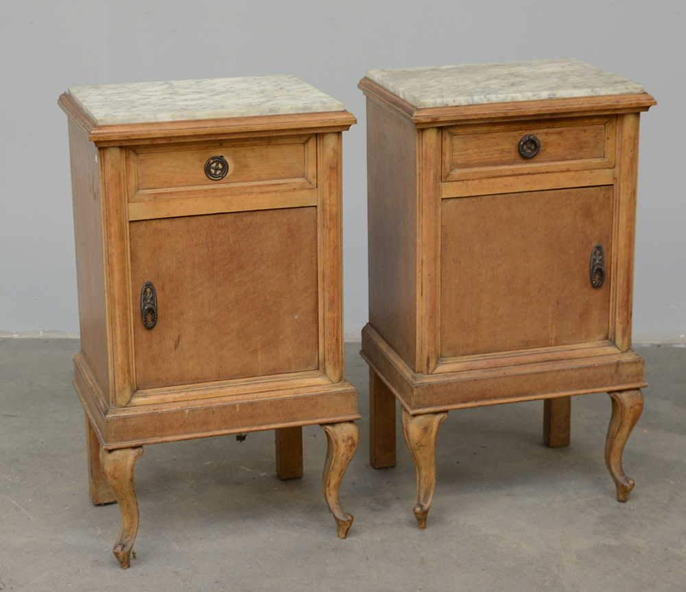 Coppia di comodini in legno chiaro ad un cassetto e uno sportello, gambe mosse e piano in marmo bianco; anni '30 del secolo XX (cm 44x79x34) (difetti e rotture)