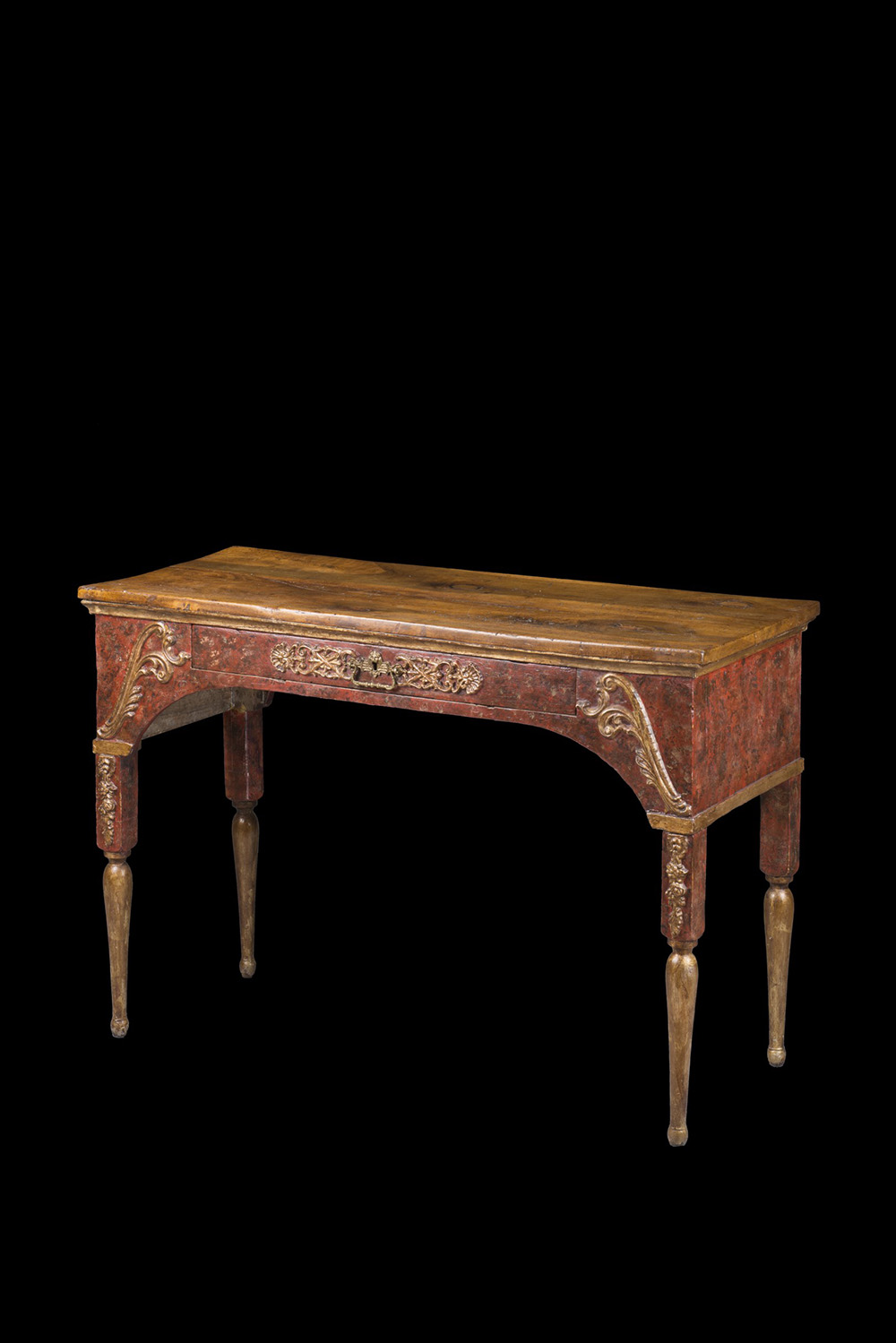 Antico tavolo scrittoio con piano in noce, cassetto nella fascia. Decorato...