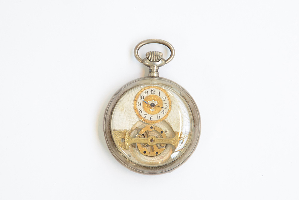 Orologio da tasca da uomo in argento, quadrante con numeri arabi, parte del movimento a vista, movimento con carica remontoir (diam. mm 53)(gravi difetti)
