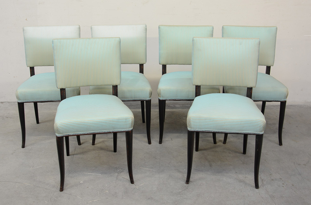 Gruppo di sei sedie con schienale e seduta imbottita. Gambe mosse (difetti)