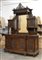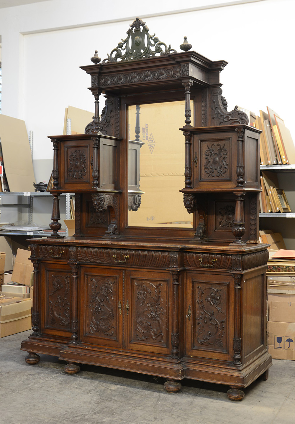 Controbuffet in noce di gusto neorinascimentale composto da una base con avancorpo a quattro sportelli con pannelli intagliati a ramages su fondo sabbiato e divisi da colonnine e tre cassetti nella fascia baccellata; alzata con specchio centrale e due mobiletti pensili laterali retti da colonnine e mensole a testa ferina; cimasa con pinnacoli e stemma, piedi a cipolla; ultimo quarto del secolo XIX (cm 186x276x67) (difetti e mancanze)