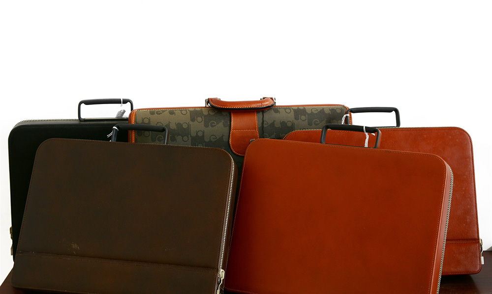 Lotto di cinque borse da lavoro di cui quattro rigide in diversi colori e materiali (difetti)
