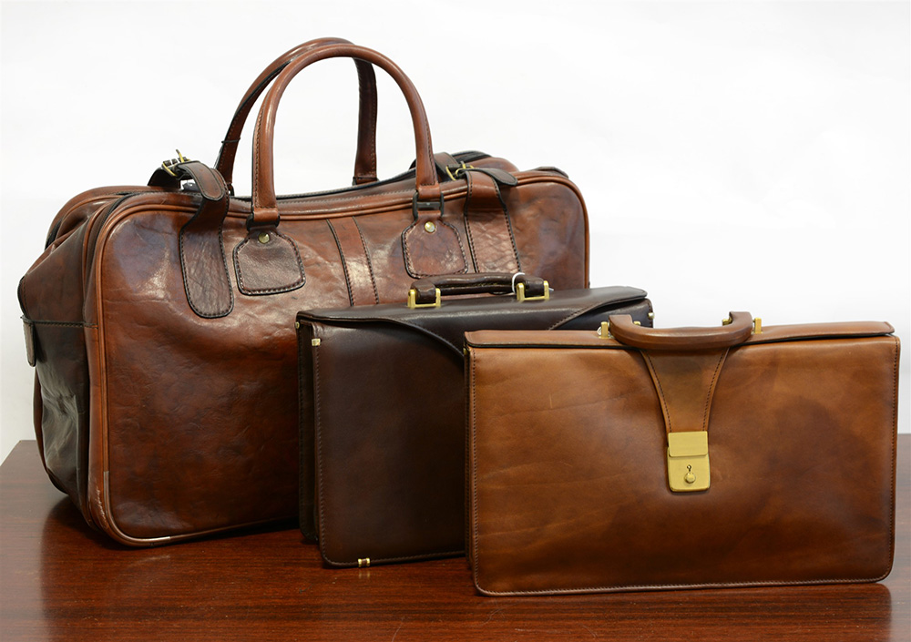 Lotto composto da un borsone da viaggio e due borse da lavoro in cuoio
