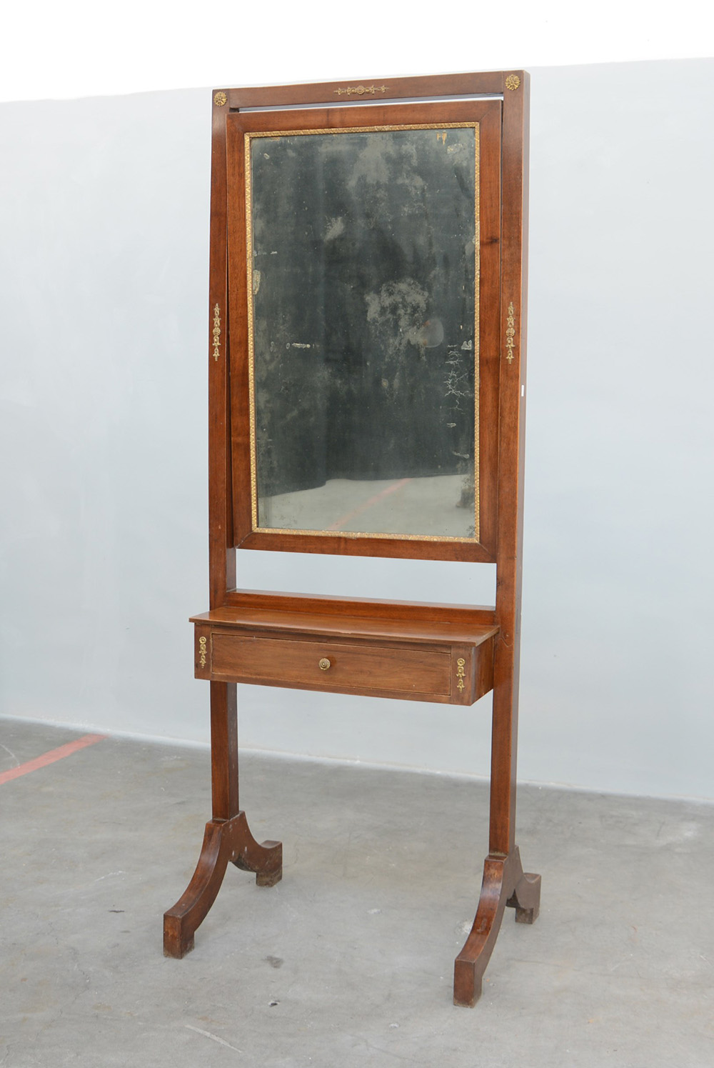 Psiche Impero in noce ad un cassetto con specchio basculante decorato a palmette dorate. Applicazioni in bronzo dorato. Montanti dritti terminanti con piedi mossi (cm 70x184x55) Sec. XIX (difetti)