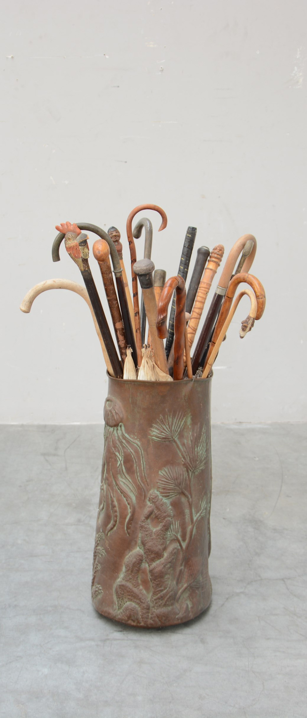 Portaombrelli in rame contenente quattordici fra bastoni, ombrelli e mazze da...