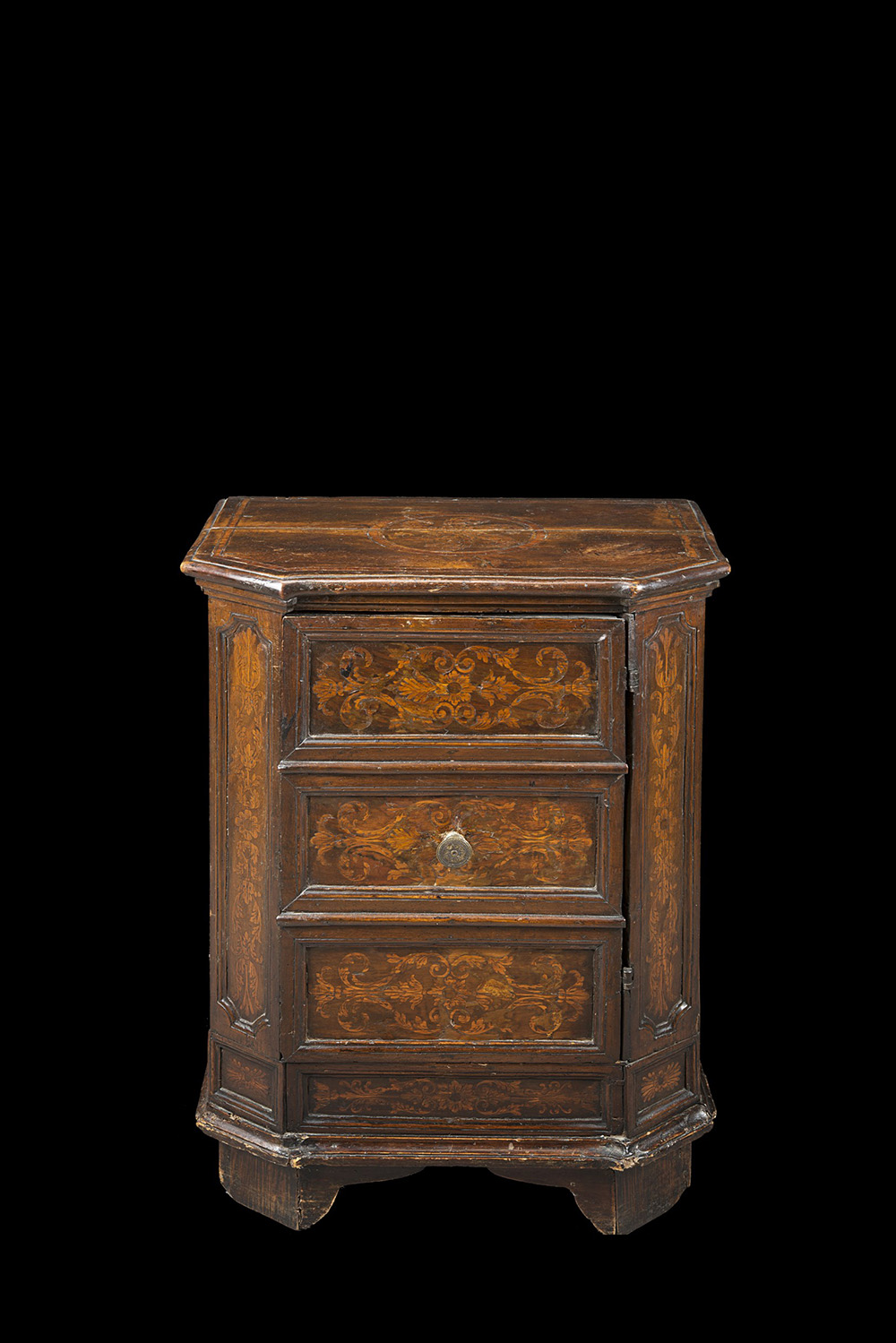 Comodino ad un'anta con fronte a tre finti cassetti. Piano, fianchi e montanti intarsiati in legno chiaro a volute e fiori. Piedi a mensola. Sec. XVIII (difetti e restauri)(inginocchiatoio trasformato)