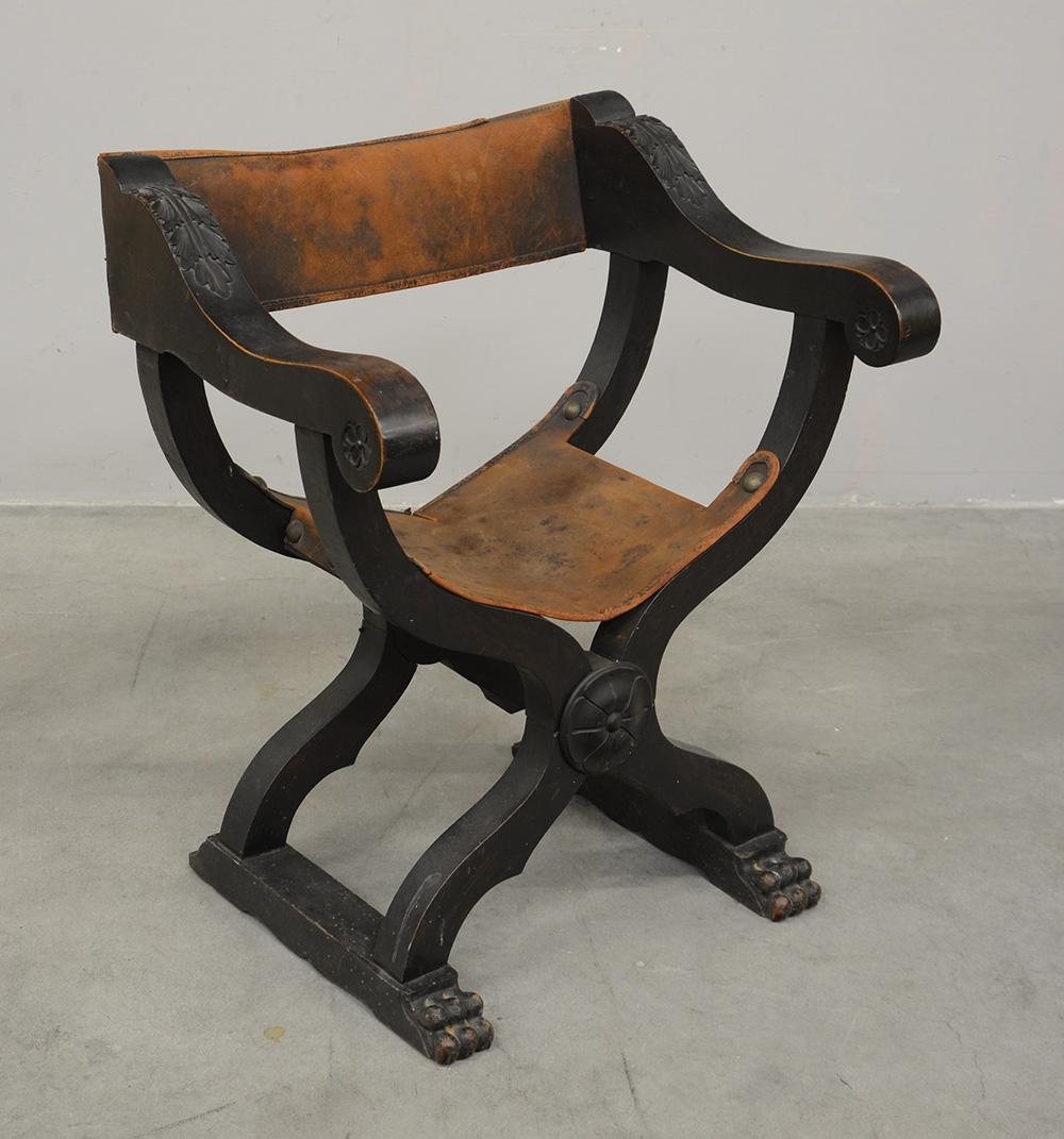 Sedia in legno tinto scuro con intagli a foglie di acànto e zampe ferine, seduta e dorsale in cuoio borchiato; ultimo quarto del secolo XIX (difetti)