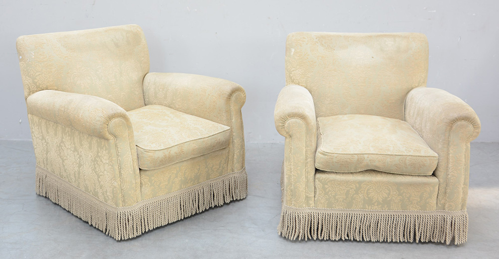 Coppia di poltrone rivestite in tessuto operato nei toni del grigio e beige con passamaneria a frange (difetti)