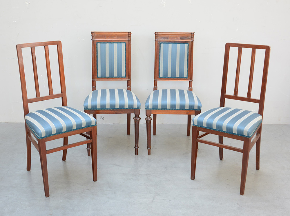 Lotto composto da due coppie sedie diverse rivestite in tessuto a righe (difetti)
