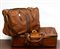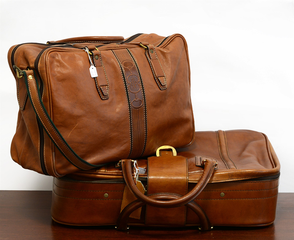 Lotto composto da una valigia e un borsone da viaggio in pelle color tabacco