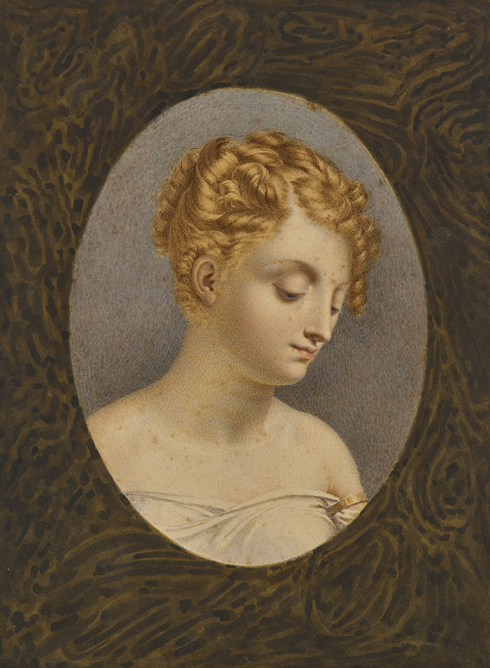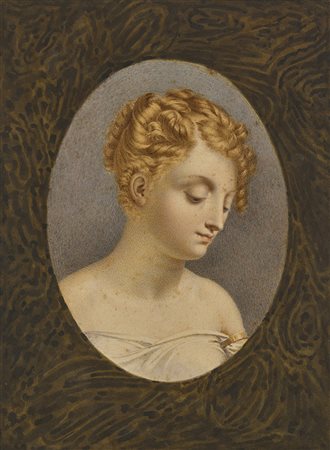 School of the 19th century "Portrait of a Girl with Blond Hair" watercolour on paper (cm 16.5x12.5) Framed (defects)
