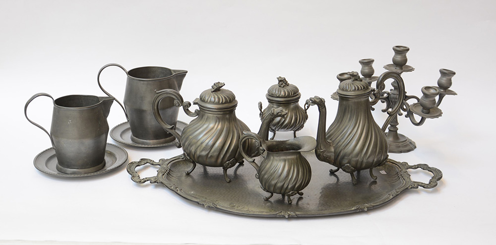 Lotto di peltri composto da: un servizio da te e caffè composto da quattro pezzi, un vassoio biansato, un candeliere a cinque fiamme, due brocche e due piatti di epoche e decori diversi (difetti)