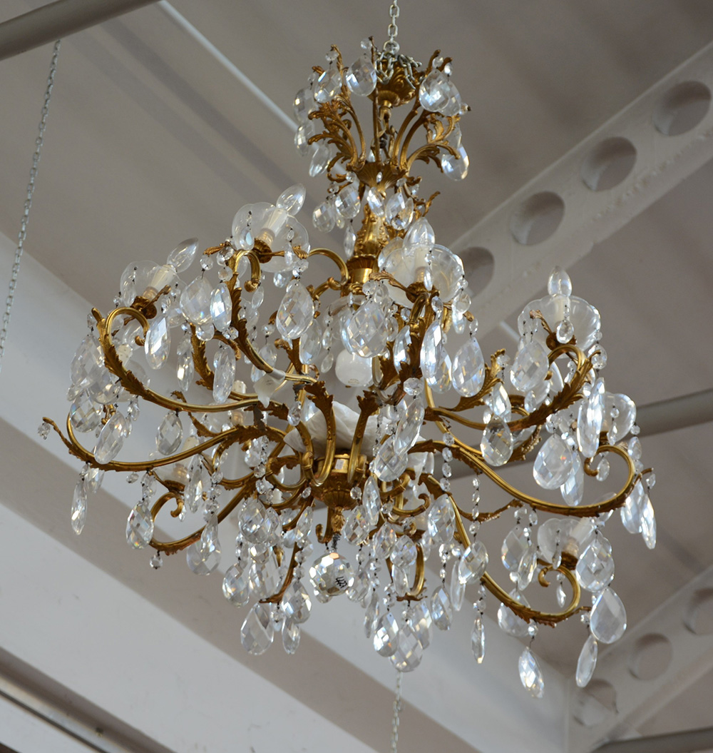 Lampadario a 15 luci in metallo dorato e cesellato a motivi vegetali e gocce in vetro (h cm 100) (difetti)