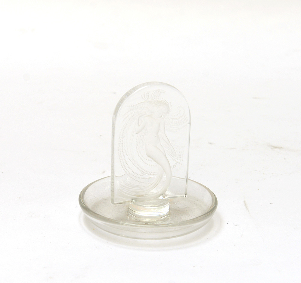 Porta anelli in vetro incolore soffiato in stampo con figura di ninfa. Firma a punta sotto la base (d cm 10 h cm 10)