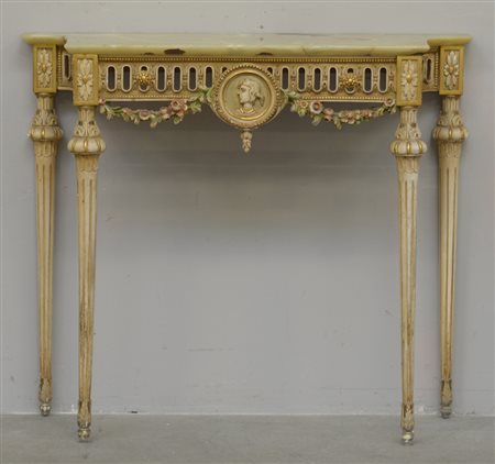 Consolina in legno laccato, dorato e intagliato con medaglione e motivi floreali, gambe scanalate, piano in onice (cm 100x88x32)(difetti)