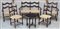 Fornitura da salotto in legno tinto con gambe tornite, braccioli e schienali a giorno mossi, seduta in corda di paglia intrecciata, composto da un divano a due posti, due poltrone e due sedie e un tavolino. Fine sec. XIX (difetti)