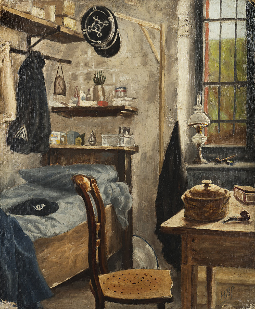 "Interno di stanza di soldato" olio su tela applicata su cartone (cm 30x25) Siglato in basso a destra HVS e inscritto al retro (difetti)