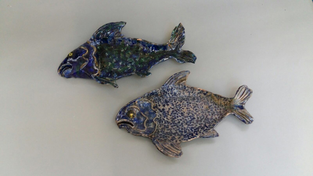 Lotto di due sculture in terracotta smaltata nei toni del blu raffiguranti pesci (difetti)